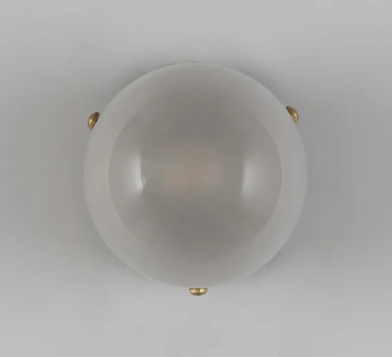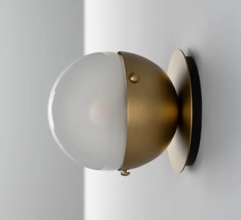 Déclinaison de l’applique Pulsar, le modèle Molécule 1 se présente sous la forme d’un globe en verre sablé placé sur une base en laiton. La base vient englober la moitié du globe et est serti de 4 petits clous. Toujours d’inspiration art déco, le luminaire prend cette fois-ci des allures plus marines et rappellent les luminaires d’un bateau.