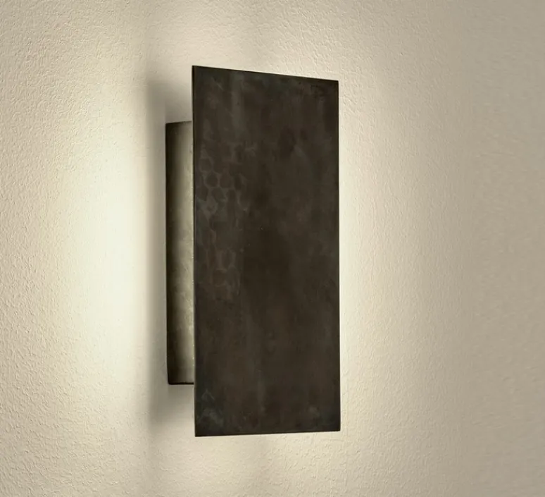Ainsi, la forme suit la fonction. Dans cette version applique murale, ce luminaire est composé d’une base surmonté d’une plaque rectangulaire autour de laquelle est diffusée une lumière indirecte. Cette disposition permet de révéler tous les reflets bleutés de l’acier et de former un halo autour de l’applique.