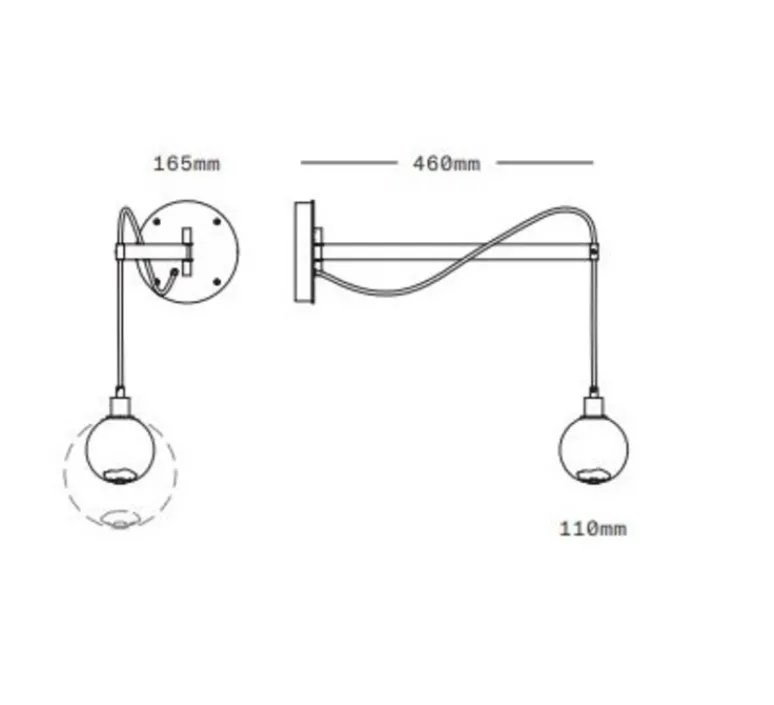 La sphère en verre mesure 11 cm de diamètre, le bras articulé en laiton mesure 46cm et le câble noir en textile ajustable mesure 1,8m.
