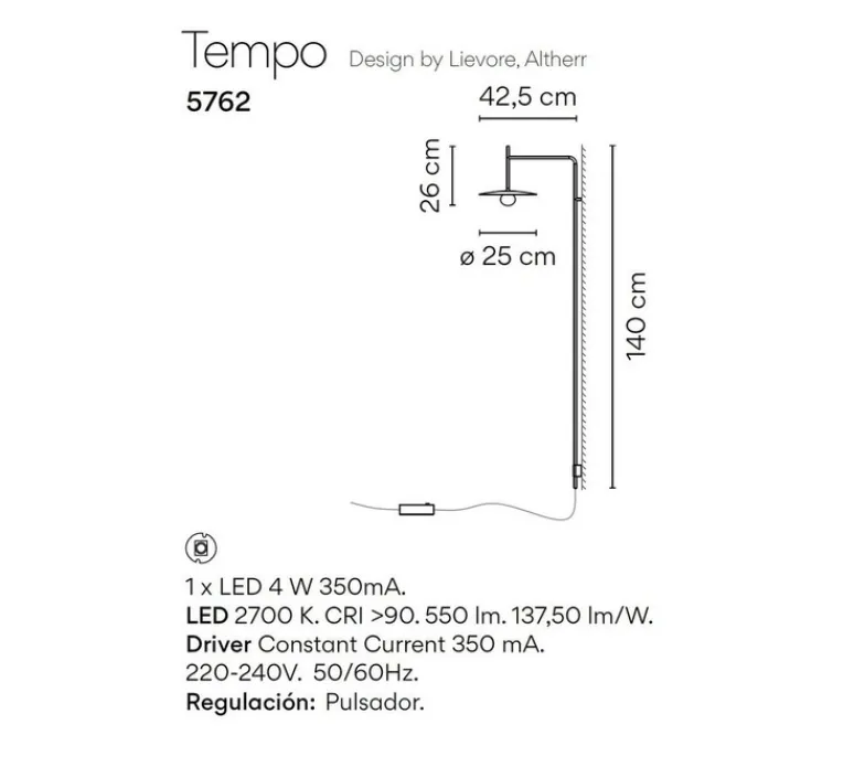 L’applique murale Tempo 5762 mesure 140cm de hauteur pour une profondeur de 42,5cm. Il existe plusieurs formes et couleurs dans la même collection et il existe également une version avec un bras déporté.