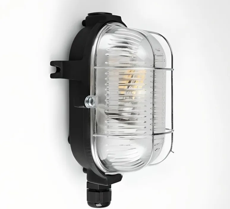Cette lampe intemporelle trouve aussi bien sa place dans une salle de bain que dans une buanderie, dans un garage que sur une terrasse. Elle est composée d’un socle en fonte, d’un verre strié et d’une cage en métal.