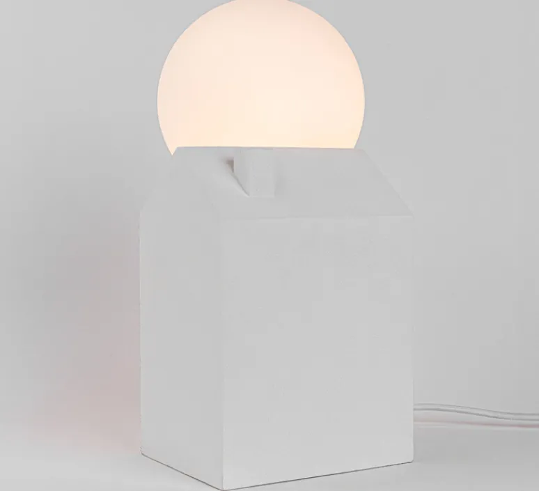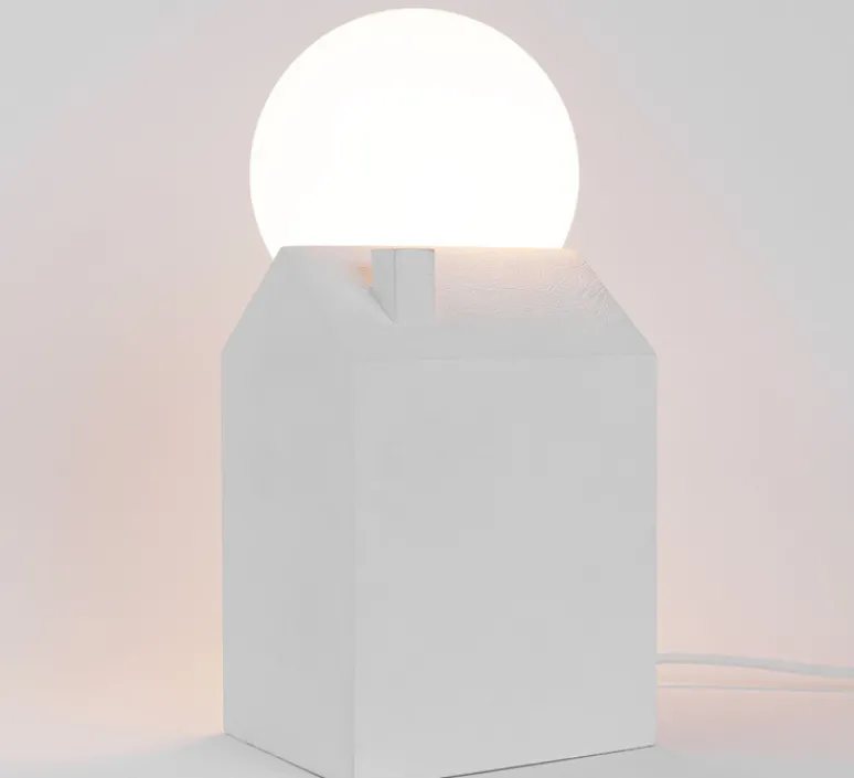Cette lampe se distingue par sa forme cubique minimaliste, évoquant une maison blanche surmontée d’une sphère lumineuse rappelant la pleine lune. Ce design épuré s’adapte parfaitement à différents styles de décoration, de l’ultra-moderne au plus classique, apportant une lumière douce et chaleureuse.