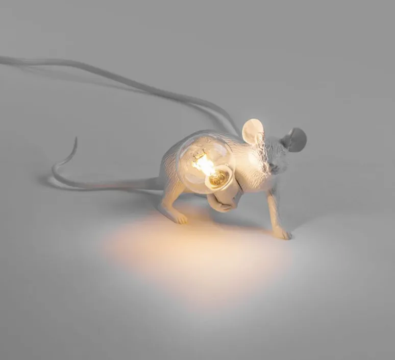 Mouse Lamp Lop Lying Down est une lampe à la forme d’une souris au pelage blanc, trois pattes posées au sol, tenant dans sa dernière patte une ampoule et son câble blanc. Telle une étrange sculpture lumineuse, Mouse Lamp Lop Lying Down se fait remarquée dans chaque intérieur, qu’elle soit posée sur une table de nuit ou cachée entre deux livres sur une étagère.