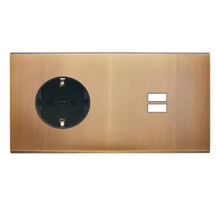 La façade Confidence en laiton massif, finition Vieux Bronze double horizontale offrant une prise Schuko 2P+T et une prise USB.