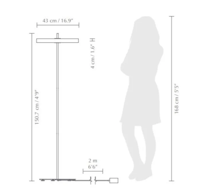 La lampe mesure 150cm de haut et 43cm de diamètre. Elle est également disponible dans différents coloris.