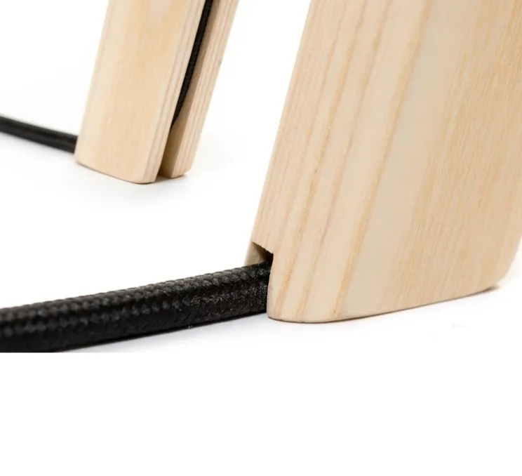 Les pieds sont en bois de frêne, en finition naturelle ou noir. Un câble textile noir de 3,35 mètres vous permettra de déplacer votre lampadaire où vous voulez.