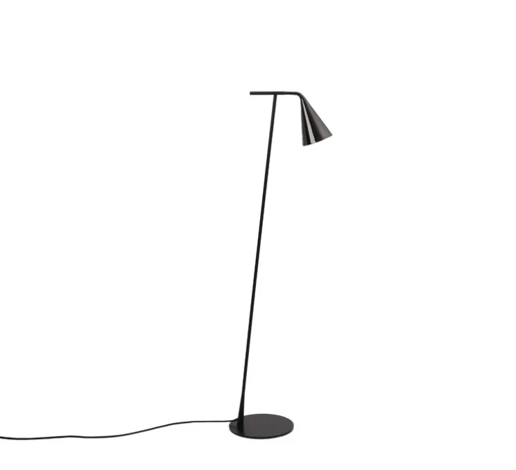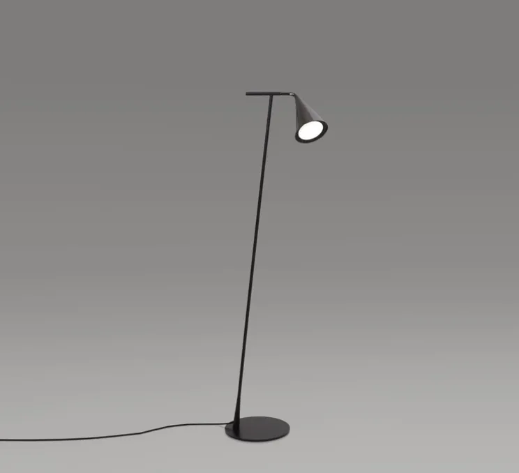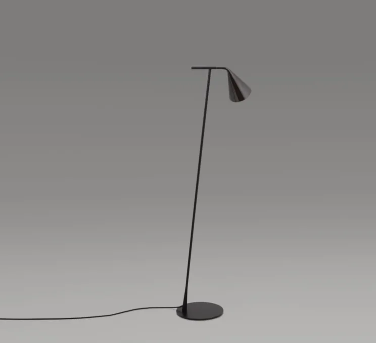 Sa silhouette conique, longiligne et minimaliste, soulignée par une finition noir mat et des détails noir chromé, confère à ce lampadaire une allure sculpturale. Il trouve naturellement sa place dans un salon raffiné, un coin lecture ou un espace professionnel, où son design orientable à la fois discret et affirmé permet de diriger la lumière avec précision. Le contraste entre les finitions métalliques enrichit subtilement les ambiances.