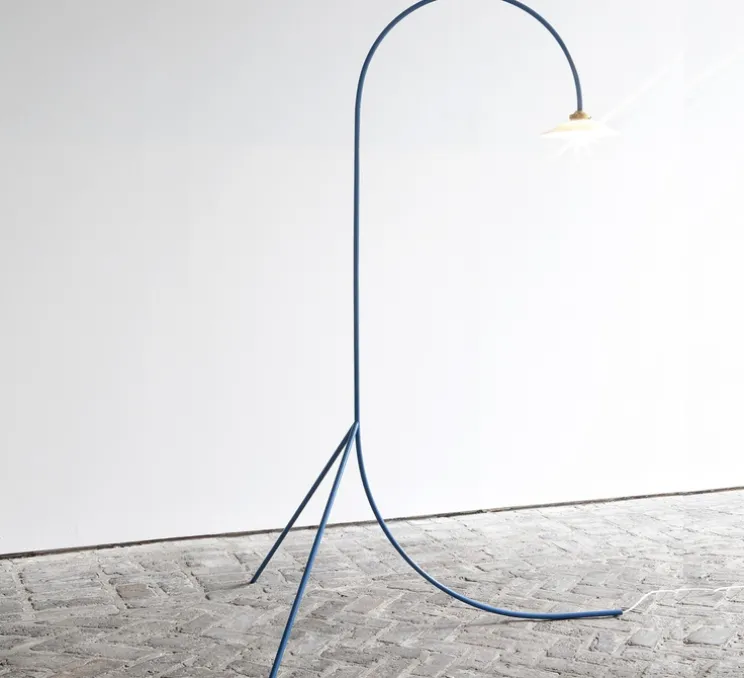 Le design de cette lampe est d’une simplicité presque naïve, et pourtant, les lignes qui la compose remplissent l’espace de manière ludique et colorée. Le lampadaire n°1 est composé d’un long tube courbé et de deux pieds droits en acier bleu ainsi que d’un abat-jour blanc qui, selon Hannes Van Severen, « a une forme fantastique : parfaitement neutre ».