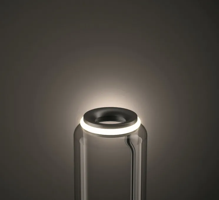 Les éléments sont en verre soufflé transparent, la base et les anneaux sont en fonte d’aluminium, les bras latéraux internes sont en acier hydro formé et les diffuseurs externes à anneau sont en silicone optique opalin moulé par injection. La longueur du câble d’alimentation est de 2 mètres, avec variateur à pédale qui permet de varier l’intensité lumineuse de 10 à 100%. Alimentation murale avec plugs interchangeables.