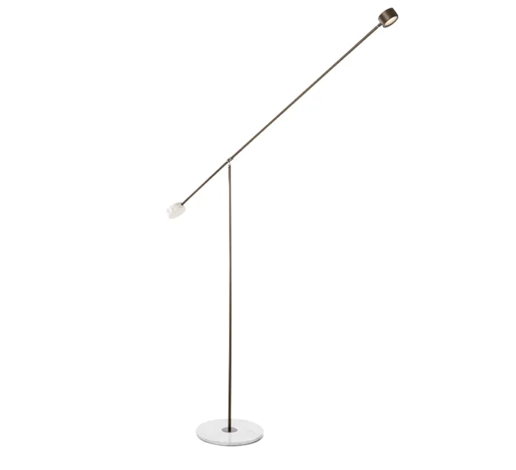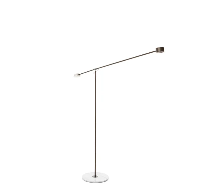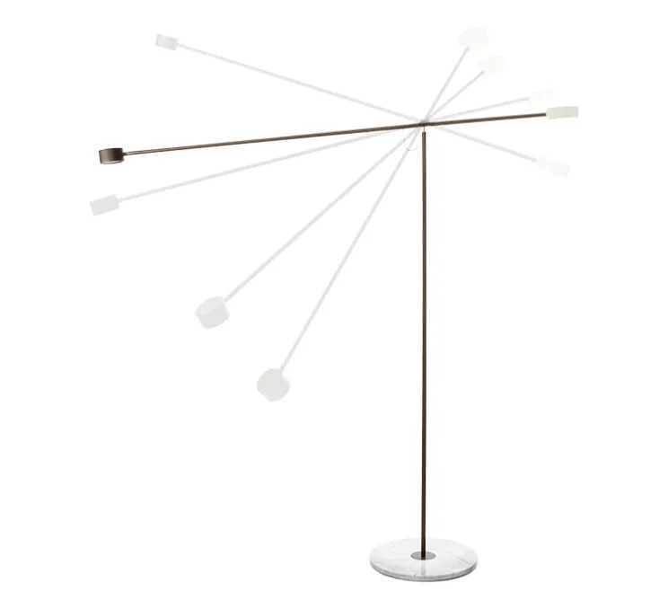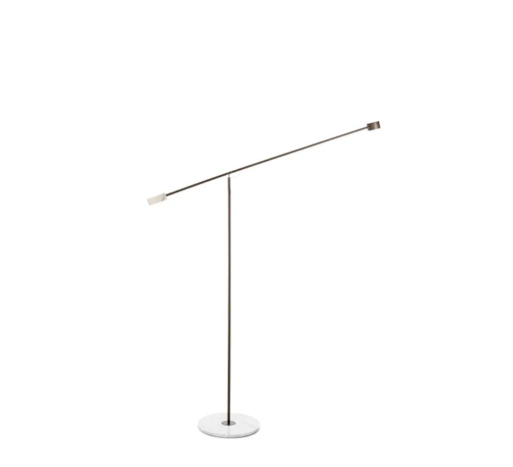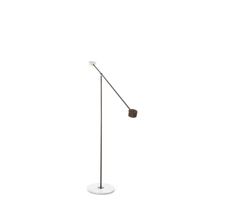 Le luminaire T-Lamp est composé d’une base circulaire en marbre, d’un long corps tubulaire en métal et d’un bras tubulaire pivotant avec d’un côté un poids en mabre circulaire et de l’autre une tête métallique circulaire intégrant la source lumineuse. S’inspirant de l’univers d’Alexander Calder, T-Lamp est gracieux et mouvementé. Le lampadaire T-Lamp se pose aisément dans une pièce de vie, un bureau ou un coin lecture.