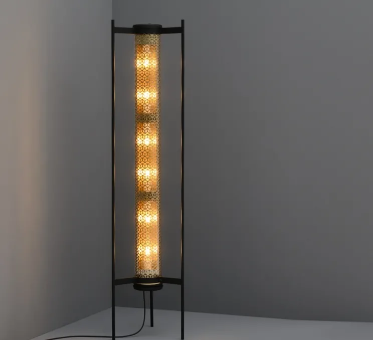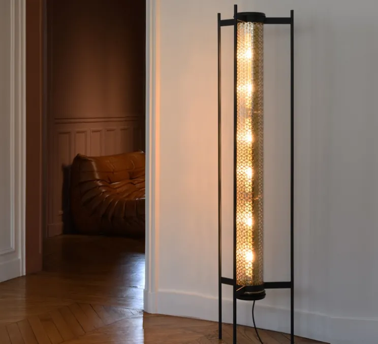 Sa structure tubulaire plus industrielle offre un contraste saisissant avec l’élégance du laiton doré. La lumière se disperse au travers des trous de la grille pour une diffusion toute en douceur, qui laisse resplendir le lampadaire. Son style moderne et chic est idéal pour illuminer un salon, offrir une ambiance golden hour à votre couloir et éclairer votre chambre