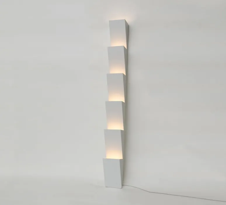 De forme longiligne avec un effet escalier, ce luampadaire en métal recouvert d’un poudre blanche, mesure 150 cm de hauteur et 15 cm de long.