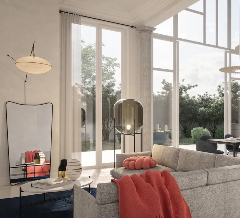Le lampadaire Oda Big est disponible en plusieurs coloris (verre fumé ambre, blanc mate, verre fumé ambre acétate et verre fumé gris acétate).