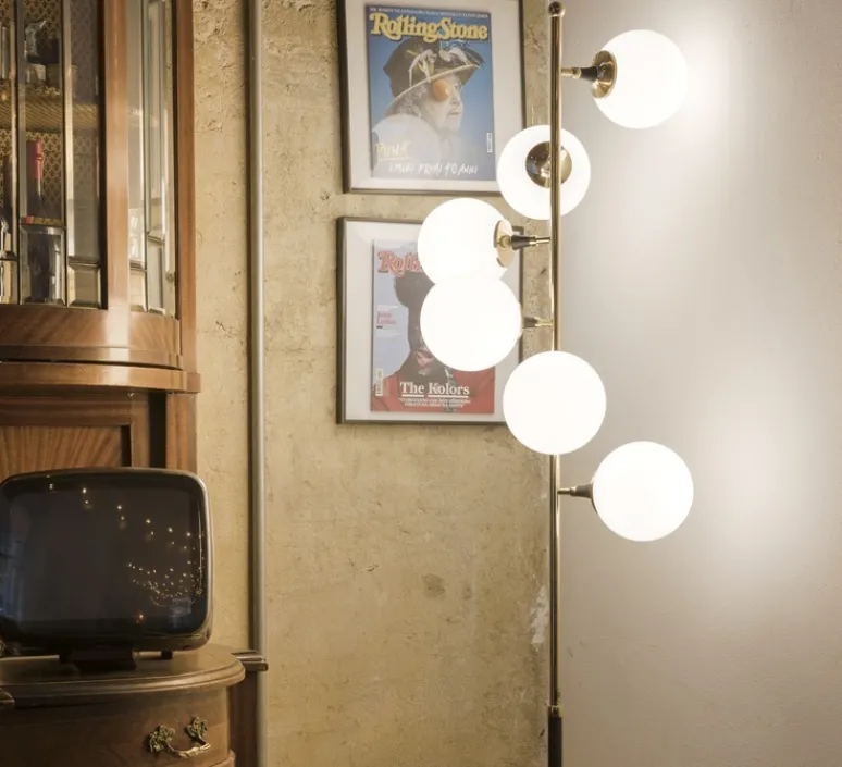 Inspiré des années 1950, le lampadaire Galassia éblouit votre intérieur grâce au mouvement gracieux de ses six globes en verre posés autour de sa structure.