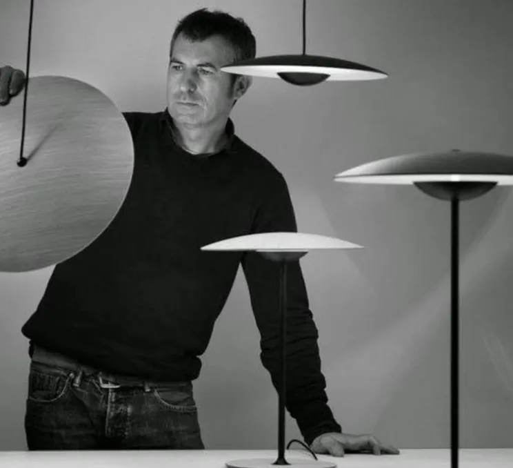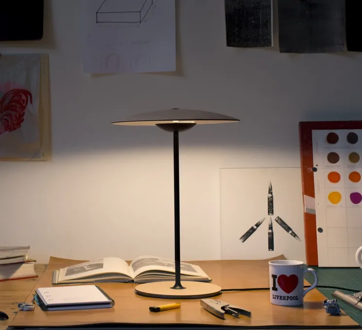 Cette lampe à poser créée par Joan Gasper pour la maison Marset fait référence à un disque de lumière extrêmement léger et rend hommage aux tambours de Ginger Baker de Cream, le groupe de rock des années 1960.