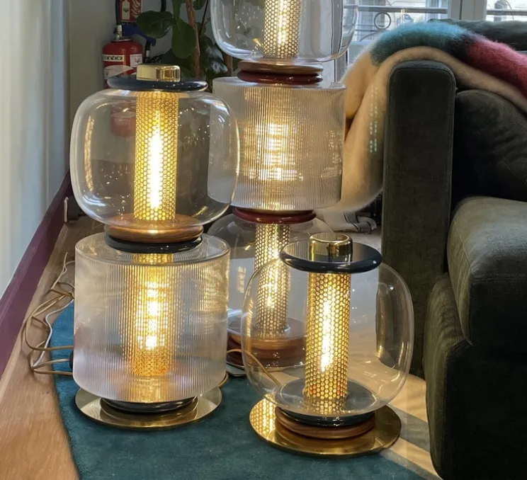 Entre sculpture et totem, la lampe Loulou reprend le vocabulaire de la série de lampe Vadim et en offre une toute nouvelle interprétation. Jouant sur les transparences, les globes de verre soufflé sertis d’anneaux en noyer et bois laqué révèlent une cage en métal perforé. Au gré des superpositions et des envies, Loulou se décline en différents modèles : 1, 2 ou 3 modules. La lampe à poser Loulou trouve sa place dans votre bureau, votre chambre, votre salon ou votre entrée.
