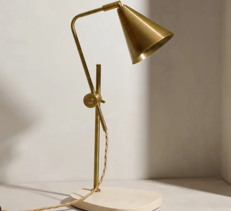 Cette lampe de table faite d’une structure en laiton est dotée d’un petit abat-jour permettant de diffuser un éclairage direct et précis. Outre son charme et son style vintage, elle est aussi dimmable grâce à son ampoule permettant de régler l’intensité de l’éclairage à sa guise.