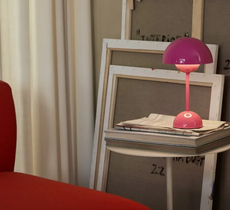Découvrez la baladeuse Flowerpot VP9, finition rose tanguy, dessinée par le célèbre designer scandinave Verner Panton en 1968 et éditée par la maison danoise AndTradition.