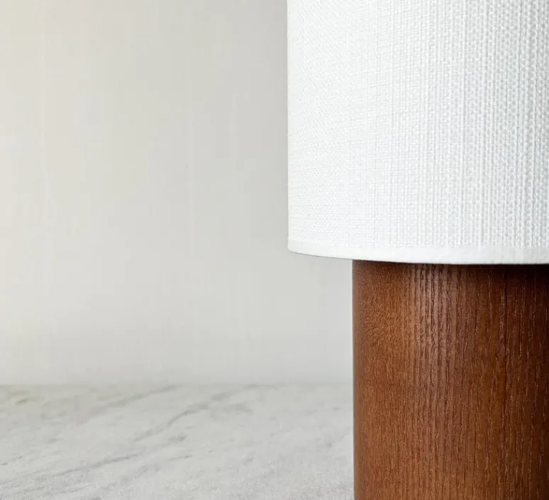 Le pied de lampe Simone est en bois de hêtre teinté noyer et son abat-jour est en lin blanc. Simone mesure 33cm de hauteur et 18cm de diamètre.