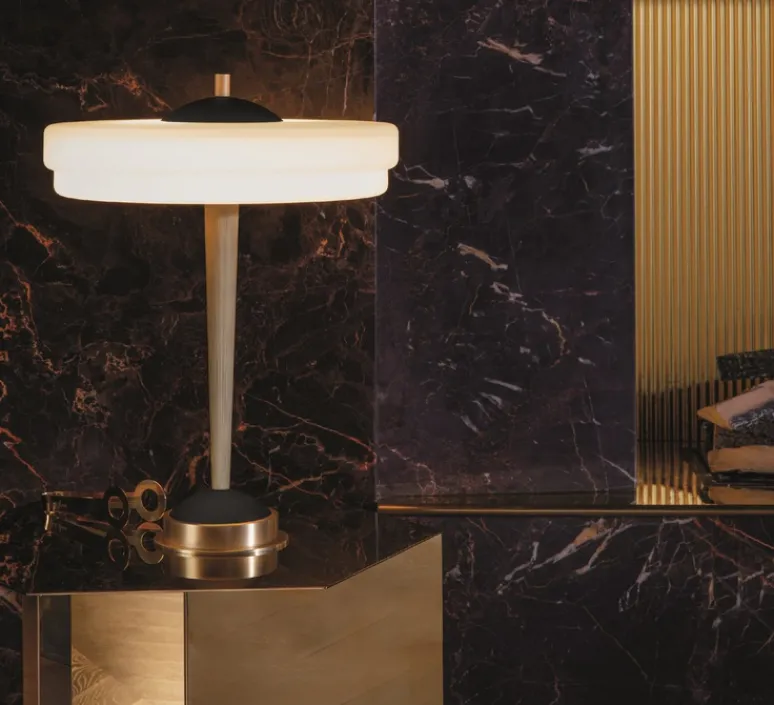 Née d’un savoir-faire d’excellence, Trave est principalement faite de laiton, de verre opalin avec du marbre « guatemala » : un joli marbre vert !