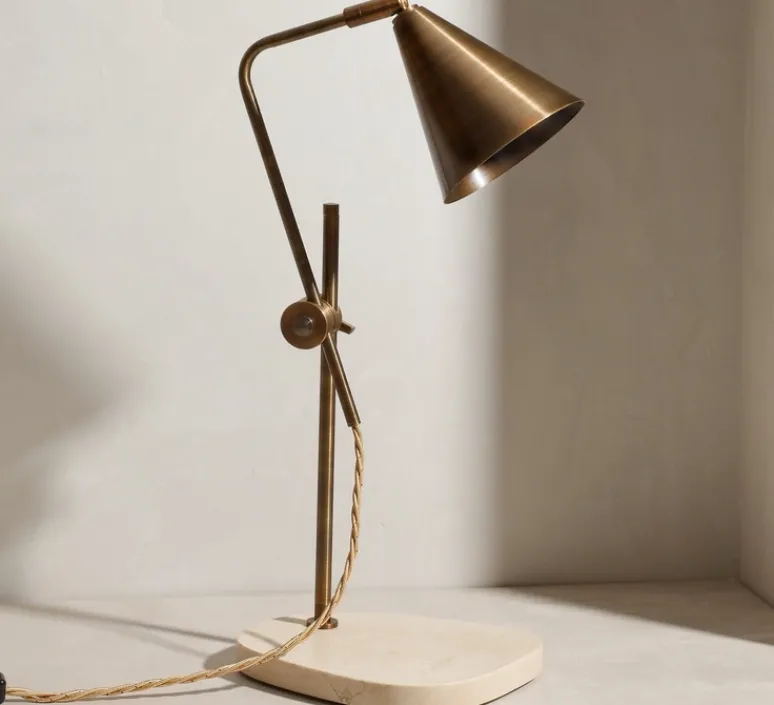 Cette lampe de table faite d’une structure en laiton est dotée d’un petit abat-jour permettant de diffuser un éclairage direct et précis. Outre son charme et son style vintage, elle est aussi dimmable grâce à son ampoule permettant de régler l’intensité de l’éclairage à sa guise.