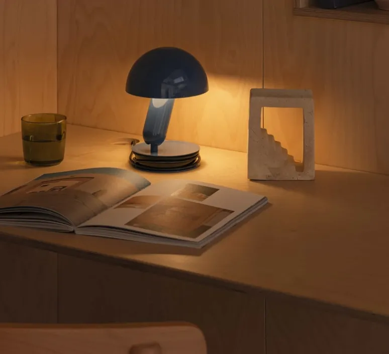 Inspirée du design industriel rétro, la lampe à poser Bela bleue, conçue par Faro Lab, revisite l’esthétique des luminaires classiques tout en y intégrant une modularité contemporaine.