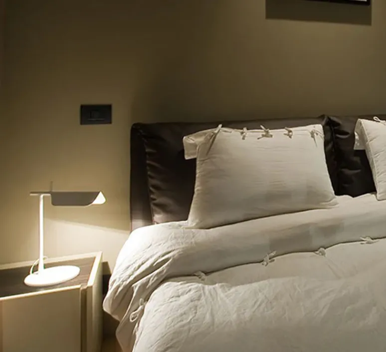 Le luminaire Tab est composé d’une base circulaire, d’un long corps tubulaire et d’une tête lumineuse pivotante en forme de feuille pliée, intégrant une petite poignée. D’un dessin fait en quelques minutes suivi de plus de quatre ans de développement, la lampe à poser Tab est minimaliste et pratique et trouve sa place dans chaque intérieur, sur une table de chevet d’une chambre ou sur une table de bureau.