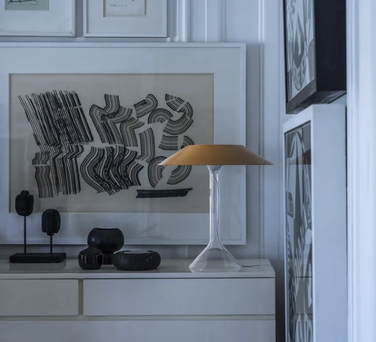 La lampe à poser Chapeaux de Foscarini est une pièce sophistiquée et élégante, caractérisée par un design minimaliste où chaque composant a été réduit au strict nécessaire. Son support en verre borosilicate, presque invisible, offre un support discret pour un cœur lumineux. Trois « chapeaux » distincts, fabriqués en métal, en verre et en Bone China, sont disposés de manière libre autour de cette source lumineuse centrale.