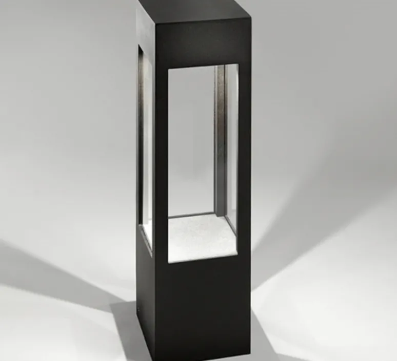 Le luminaire se présente sous la forme d’un prisme rectangulaire, encadré en aluminium massif laqué noir. La source de lumière LED n’est pas directement visible et la lumière tombe le long de l’intérieur de la lampe et illumine tout autour de la lampe.
