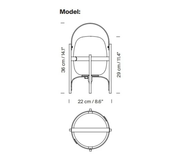 La lampe mesure 22cm de diamètre et 36cm de hauteur. La source lumineuse (E27, 2,5W) est fournie.