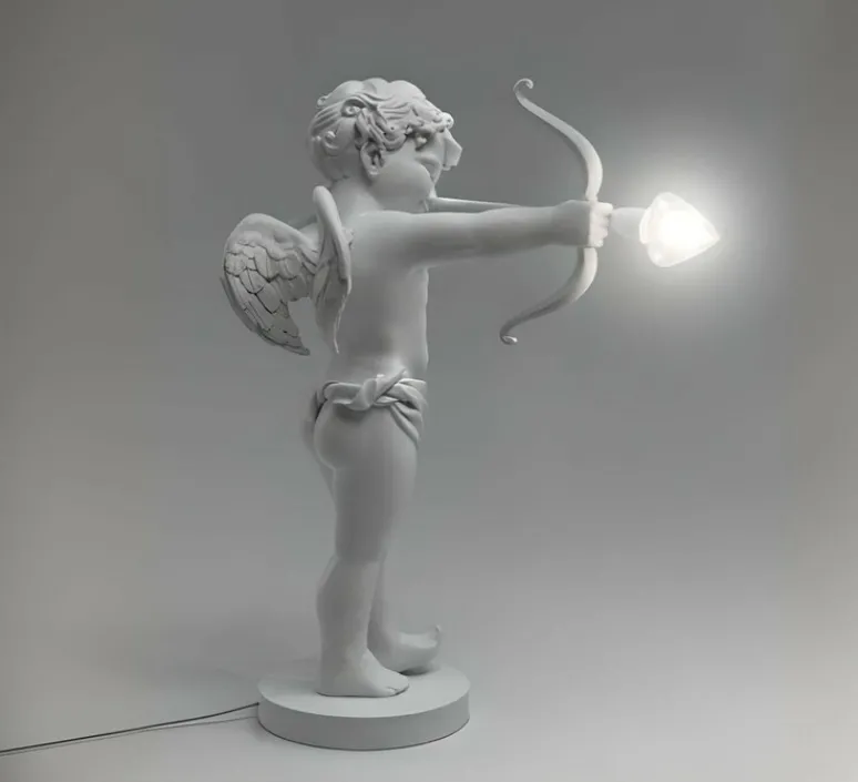 Cette lampe à poser au style kitsch représente un petit cupidon prêt à vous atteindre en plein cœur…