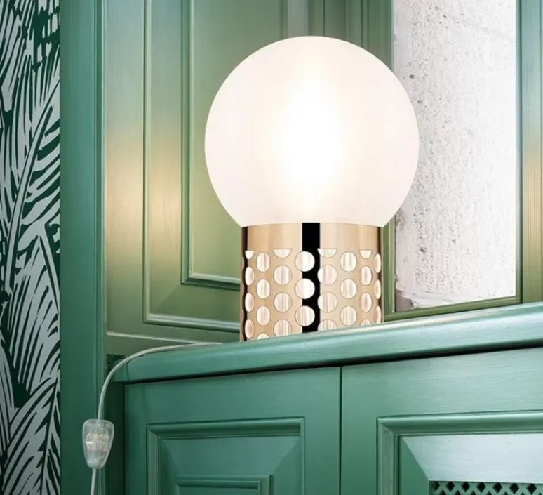 Au style rétro glam, cette lampe de table est composée d’une base à pois et d’une sphère brossée à la main. L’effet « à pois » de la base est recréé en superposant deux couches de matériau durable de Slamp : celle du dessous, fabriquée à la main, et celle métallique du dessus en Goldflex®.