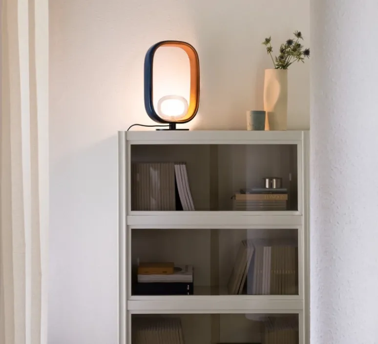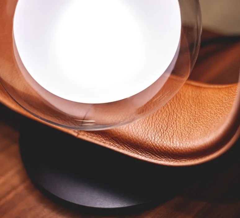 Le corps de la lampe combine du métal noir texturé et un habillage en cuir bicolore noir et marron. À l’intérieur, un diffuseur en verre transparent borosilicaté à double face renferme la source lumineuse, tamisant la lumière de façon douce et uniforme. Cette lampe trouve sa place sur une console, une table de chevet ou un bureau, dans un intérieur sobre ou éclectique.