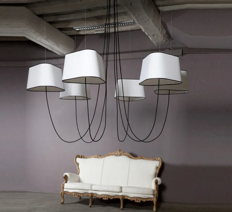Un lustre réglable en hauteur et en diamètre. Fixés sur des câbles en acier, les abat-jours peuvent être montés ou descendus à volonté grâce à un piston situé sur leur partie supérieure. Modulable en hauteur, ce lustre est aussi ajustable en diamètre total et en forme selon la distance entre les abat-jours choisie. Situés sous les abat-jours, les fils textiles colorés sont aussi des éléments décoratifs.