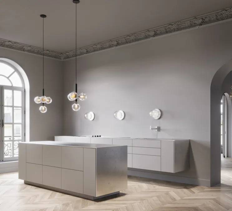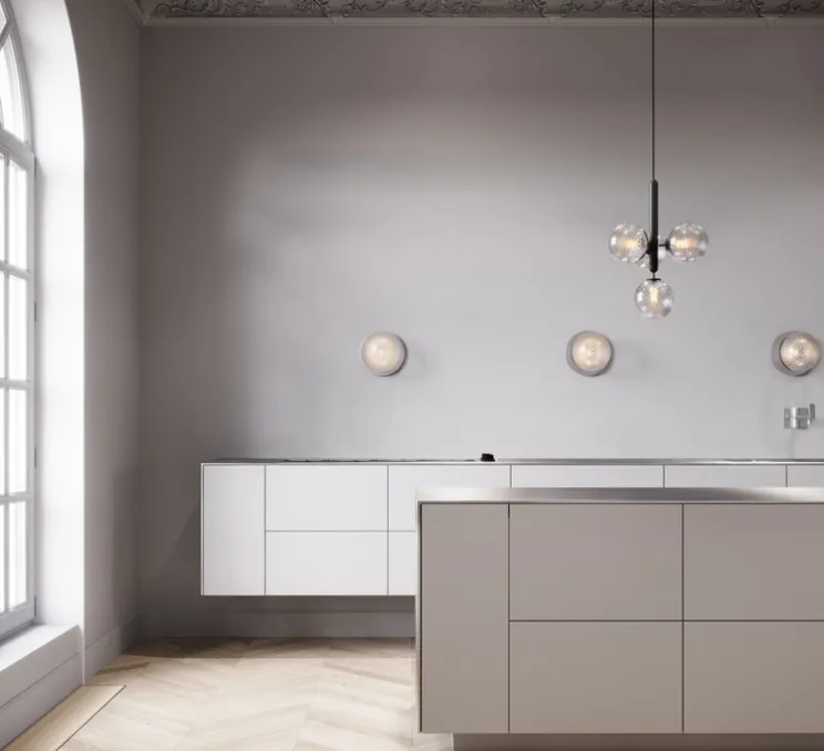 Sofie Refer puise son inspiration dans la nature. La suspension Miira 4 aux formes pures nous dévoile quatre sphères en verre soufflé transparent suspendues par une tige noire. Elle crée une atmosphère unique avec ses ombres projetées sur les murs.