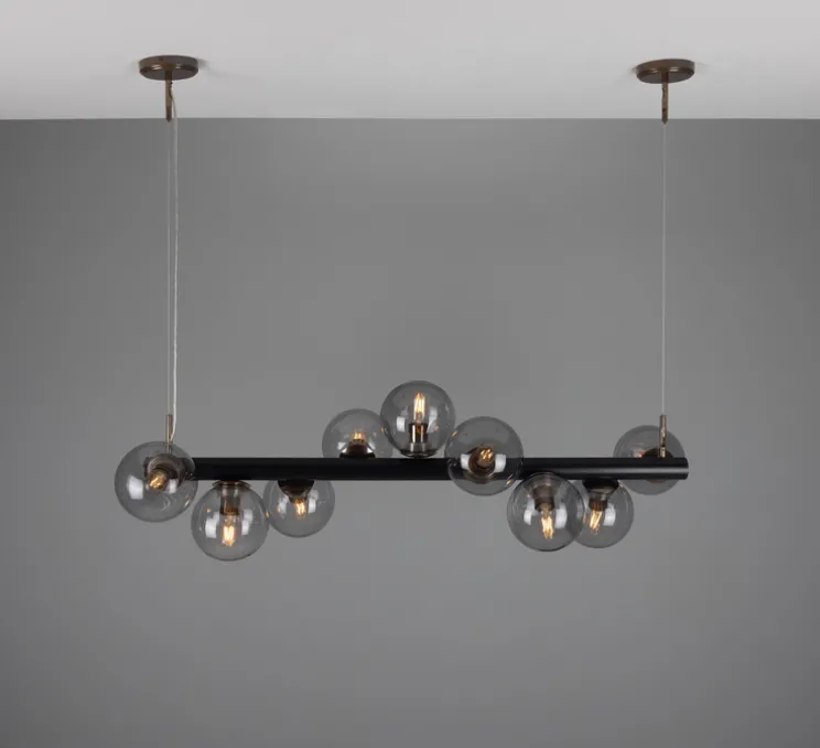L’esthétique du Moriarty est un mariage réussi entre le style art déco et une touche contemporaine. Les neuf globes en verre fumé apportent une lumière diffuse et chaleureuse, idéale pour illuminer votre îlot de cuisine ou sublimer un espace dans un hôtel ou un restaurant de luxe.