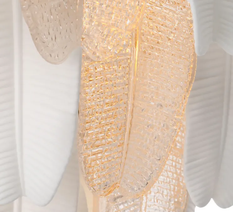Avec ses lignes organiques et sa structure raffinée, ce lustre de 60 cm de diamètre et 68 cm de hauteur crée une ambiance chaleureuse et élégante. Le verre texturé diffuse une lumière douce, tandis que la céramique blanche ajoute de la légèreté à la pièce. Son design fluide et naturel s’intègre facilement dans des espaces modernes ou inspirés de l’Art Déco.