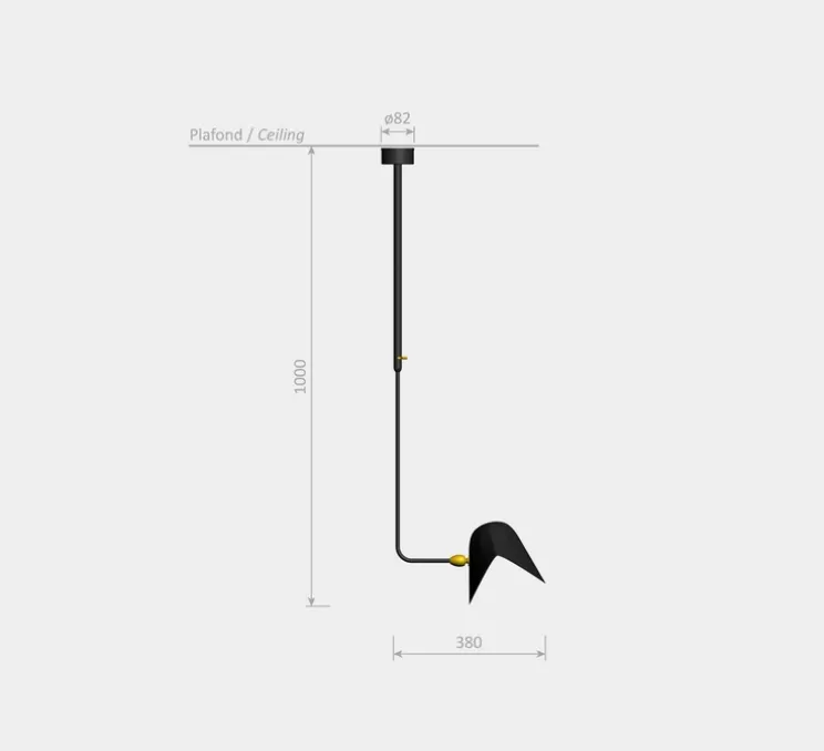Le plafonnier mesure 100 cm de hauteur et 38 cm de profondeur. La rosace mesure 8,2 cm de diamètre. L’ampoule E14 d’une puissance de 42W max est fournie. Exclusivement réservé à une utilisation intérieure.