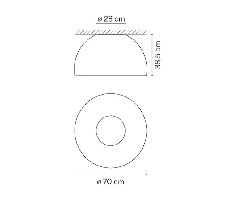 Il mesure 70 cm de diamètre et 38,5 cm de hauteur. Sa source lumineuse LED est incluse et émet une lumière blanche chaude de 2700K. Le driver est inclus. Dimmable Push 1-10V, Dali-2.