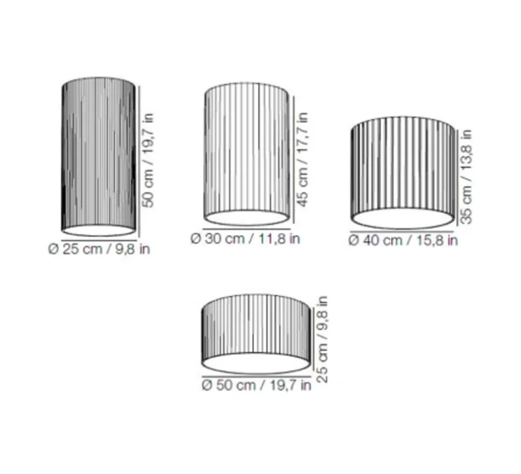 La collection Giass comporte 4 modèles qui varient en fonction de leur taille. Aussi bien au niveau de la hauteur, que du diamètre, les 4 modèles ont tous une taille différente. Le Giass 25 a une hauteur de 50cm et un diamètre de 25cm. LE Giass 30 a une hauteur de 45cm et un diamètre de 30cm. Le Giass 40 a une hauteur de 35cm et un diamètre de 40cm. Pour finir, le Giass 50 a une hauteur de 25cm et un diamètre de 50cm.
