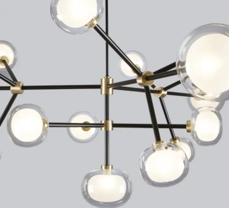 Un objet sphérique brillant double face en verre borosilicaté rend ces lampes disponibles en différentes compositions et une structure en métal revêtu de poudre époxy enrichie de détails en laiton brossé.