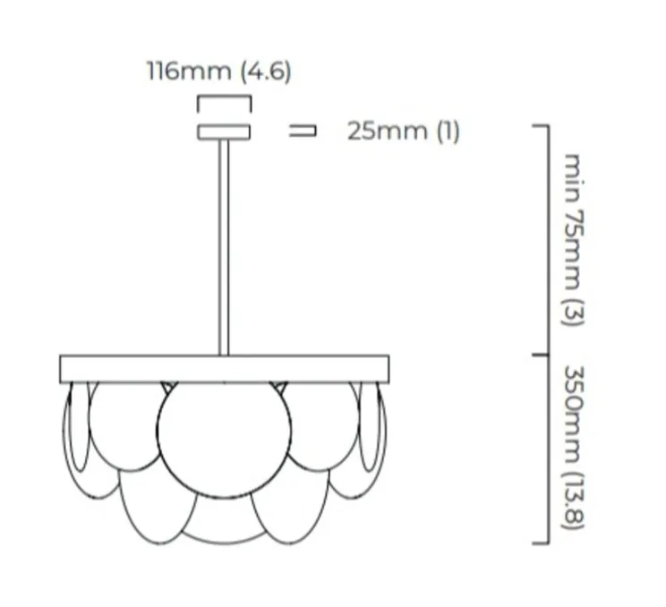 Le plafonnier mesure 60cm de diamètre et 42,5cm de hauteur. Une tige d’un mètre est fournie.