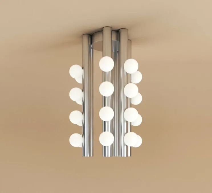 Le design de ce plafonnier repousse les frontières de la créativité, explorant le thème de la symétrie et de l’archaïque d’une manière captivante. Six Tubes 566 est une œuvre d’art en soi, organisée autour d’éléments verticaux disposés en cercle, créant ainsi un motif harmonieux et captivant. Les tubes cylindriques, méticuleusement ornés de globes lumineux, offrent une esthétique unique. Avec un total de 6 tubes et 24 globes, ce luminaire éclaire l’espace avec une luminosité enchanteresse.