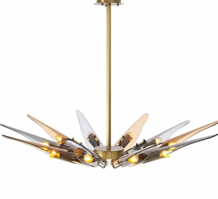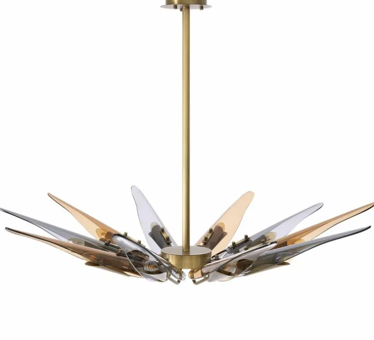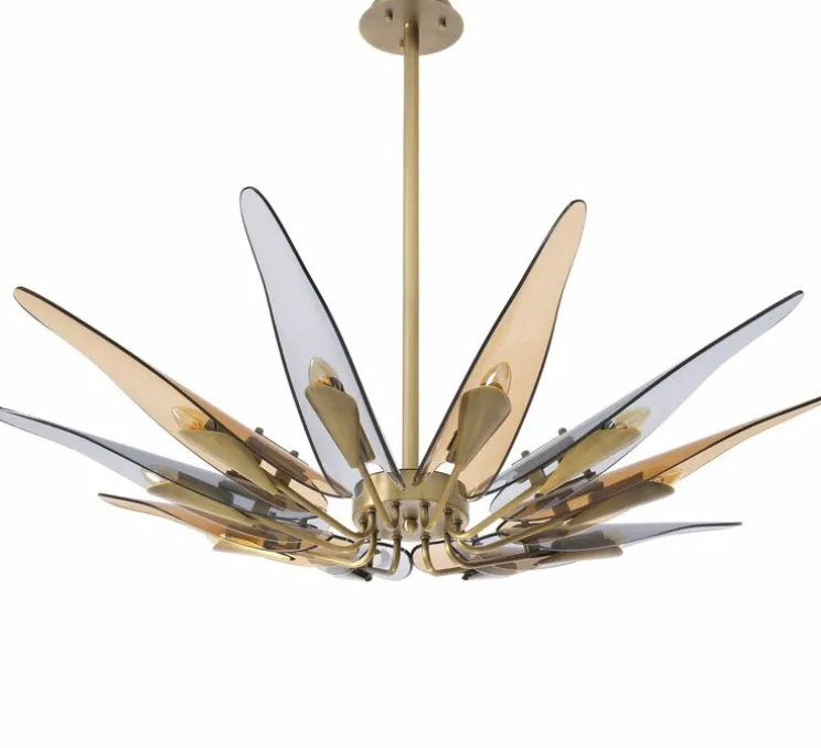 Il se distingue par sa magnifique forme florale. Doté d’une finition en laiton antique, ce magnifique plafonnier est suspendu à une tige et à un baldaquin assorti. Le luminaire comprend 10 pétales de fleurs en verre fumé et 10 en verre ambré translucide.