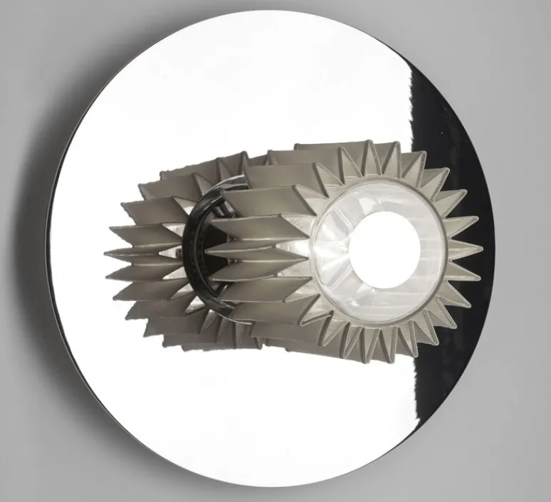 L’applique murale In the sun 270 est faite d’un disque en aluminium teinté dans lequel se reflète un diffuseur en forme de soleil.