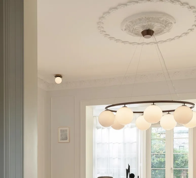 Ce modèle, taille small, couleur bronze au globe blanc opalin s’adapte à tous les styles et crée une atmosphère unique. Il s’intègre à des intérieurs privés comme à des espaces publics et trouve parfaitement sa place dans des petites pièces, dans un couloir, une entrée ou dans un espace avec un plafond bas.