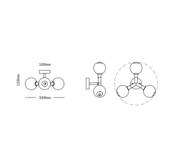 L’applique mesure 39cm de hauteur et chacune des sphères a un diamètre de 11cm. Elle est fournie avec sa source de lumière, 3 ampoules G9.