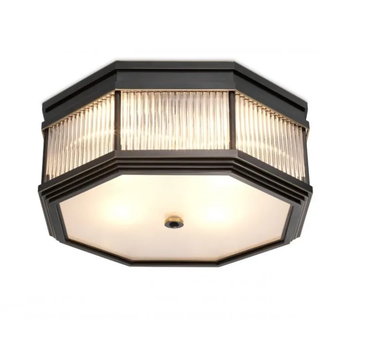 Inspiré du design contemporain Art déco, le plafonnier Bagatelle séduit par son charme et sa délicatesse. Ce plafonnier octogonale est fait en verre transparent dépoli, et il dispose d’une finition en bronze brillante.