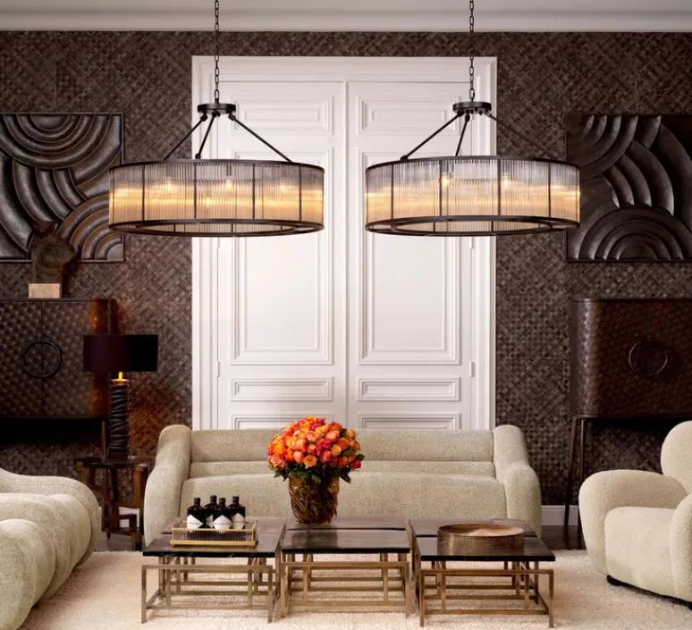 Le plafonnier Bernardi XL d’Eichholtz est une pièce maîtresse inspirée du style Art Déco.