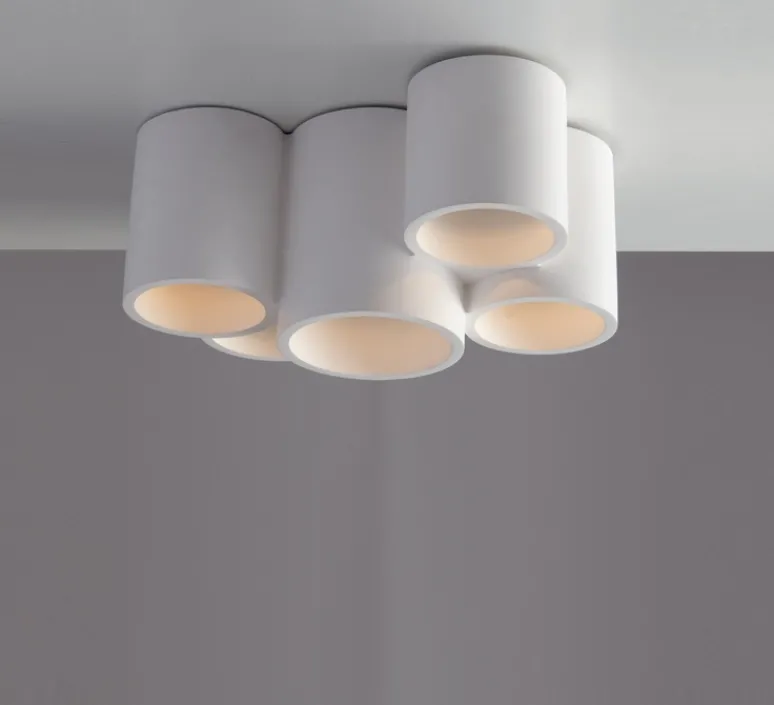 Le plafonnier Isaline Cinq se caractérise par cinq cylindres côtes à côtes, en plâtre d’une hauteur totale de 14 cm et d’un diamètre de 29,5 cm. Il garantit un effet graphique réussi. Les cylindres sont composés d’une sortie lumineuse, qui vous permet de créer un bel éclairage direct.